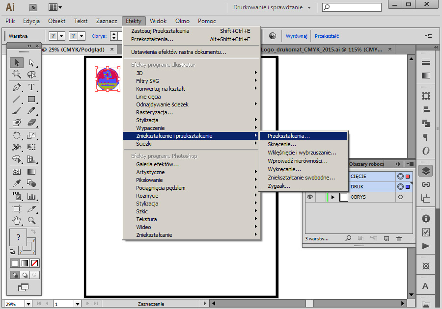 Po zaprojektowaniu naklejki w Illustratorze – stosując się do wytycznych zawartych w instrukcji (format, grubość i kolor linii cięcia, etc.), zaznaczamy warstwy „CIĘCIE” i „DRUK”.